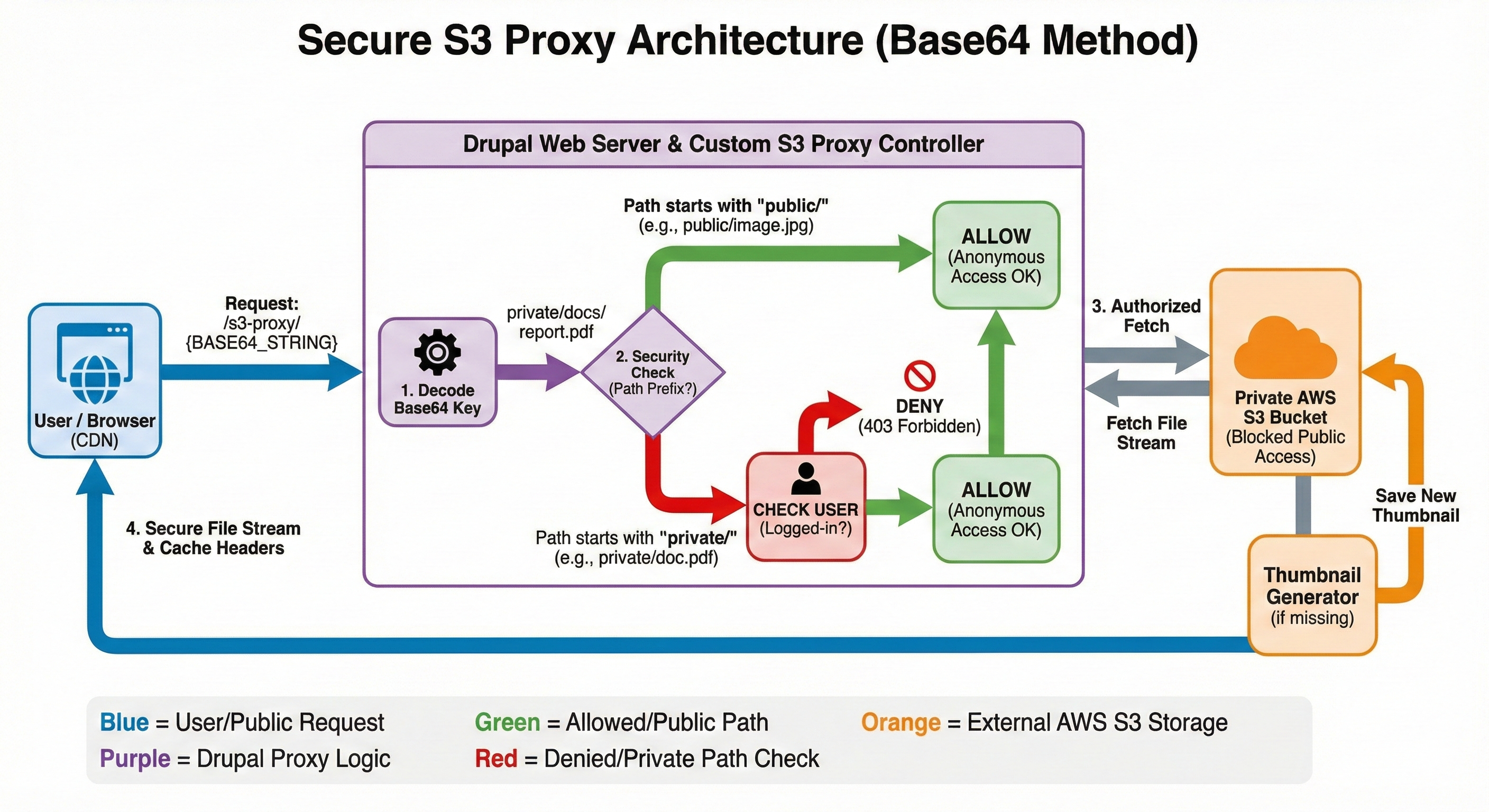 3. The Routing "Slash" Problem We cannot use a clean path like /s3-proxy/secure/docs/file.pdf because Drupal's router interprets the slashes as separate arguments. Using Regex to fix this re-introduces URL encoding bugs and security filter issues.